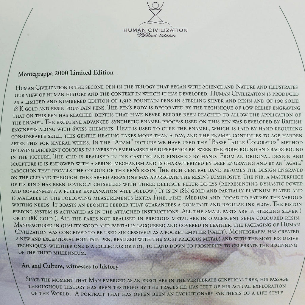 For your consideration, we present for sale this never-inked 2000 Montegrappa Human Civilization Limited Edition Fountain Pen, number 236 of only 1,912 examples produced worldwide. Fitted with an 18K Medium gold nib and preserved in Mint, New Old Stock condition, this pen remains exactly as it left Montegrappa’s workshop more than two decades ago. It is accompanied by its complete original factory presentation boxes, literature, and documentation, making this a highly desirable and increasingly scarce full-set example.