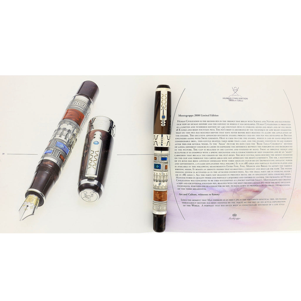Introduced in 2000, the Human Civilization Fountain Pen represents the second edition in Montegrappa’s ambitious Trilogy of Mankind, following the Science & Nature edition and preceding the final release dedicated to human achievement. Conceived at the dawn of a new millennium, this edition reflects Montegrappa’s vision of humanity’s historical journey—its struggles, triumphs, and enduring legacy—rendered through precious resin, sterling silver, enameling techniques, and masterful Italian craftsmanship.