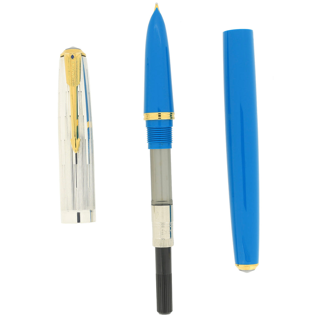 The pen features the iconic “Empire State” cap design, often referred to as the “Icicle” cap, a striking motif first introduced on the Parker 51 in 1942. This distinctive cap, with its elegant vertical pattern, was inspired by the soaring lines of the Empire State Building and remains one of the most recognizable design elements in Parker’s history. On this Special Edition example, the cap is beautifully executed in a silver finish, giving the pen a refined, architectural presence that complements the Blue barrel.