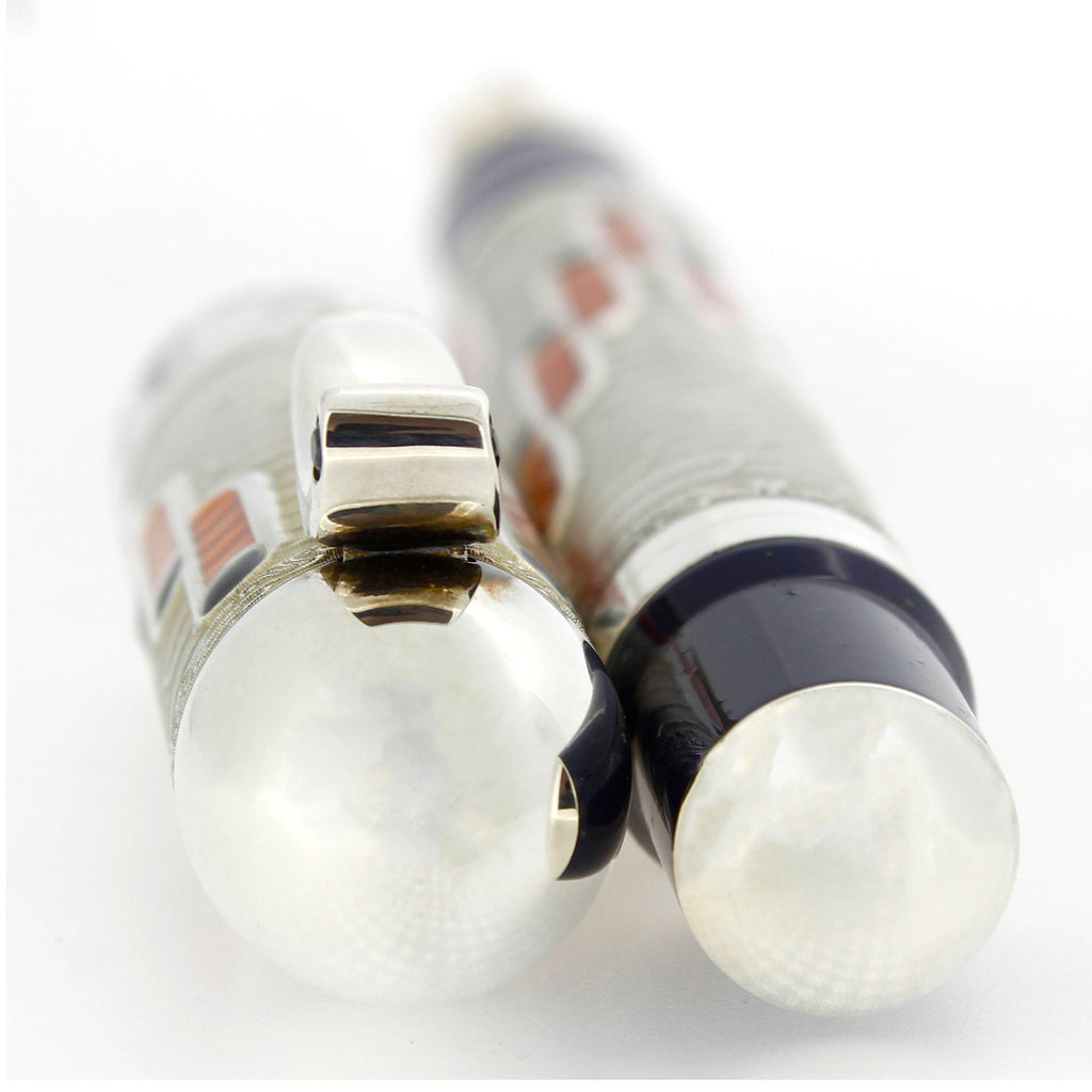 Available only to select few (only 888 fountain pens were made in sterling silver). Equipped with a flexible two-tone 18K gold nib, finely etched with a Deco-style floral pattern. A brass construction piston mechanism, with innovative features, ensures a steady ink supply through a superlative hand-turned ebonite feed.