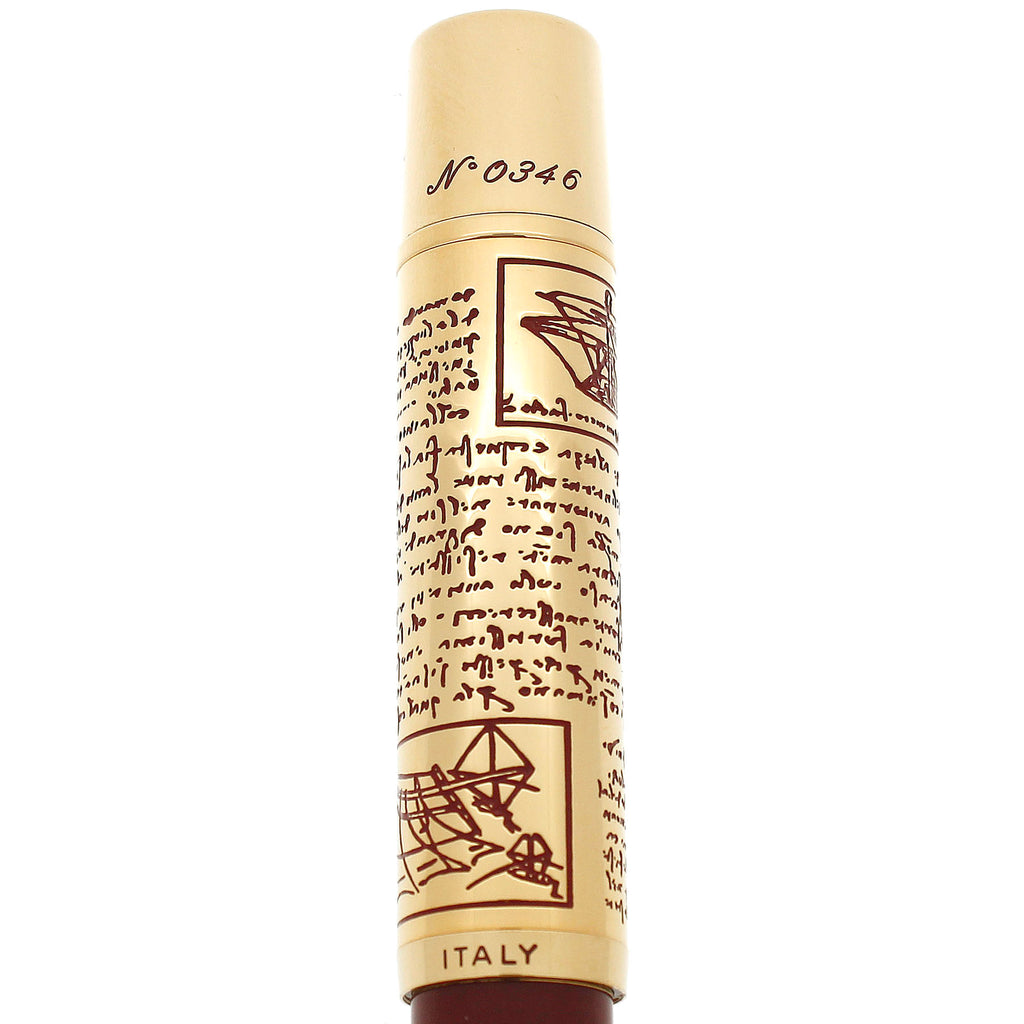 The pen features a refined Bordeaux resin barrel complemented by a gold-plated cap, richly engraved and filled with lacquer to depict motifs inspired by Leonardo’s Codex on the Flight of Birds. The result is a stunning fusion of artistry and engineering—a pen that feels as intelligent as the man it honors.